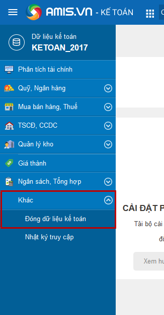 1. Đăng nhập vào dữ liệu của đơn vị trên Cloud, chọn ứng dụng Kế toán. 2. Chọn mục Khác\Đóng dữ liệu kế toán. 3. Nhấn Xem dữ liệu kế toán mẫu TT133.