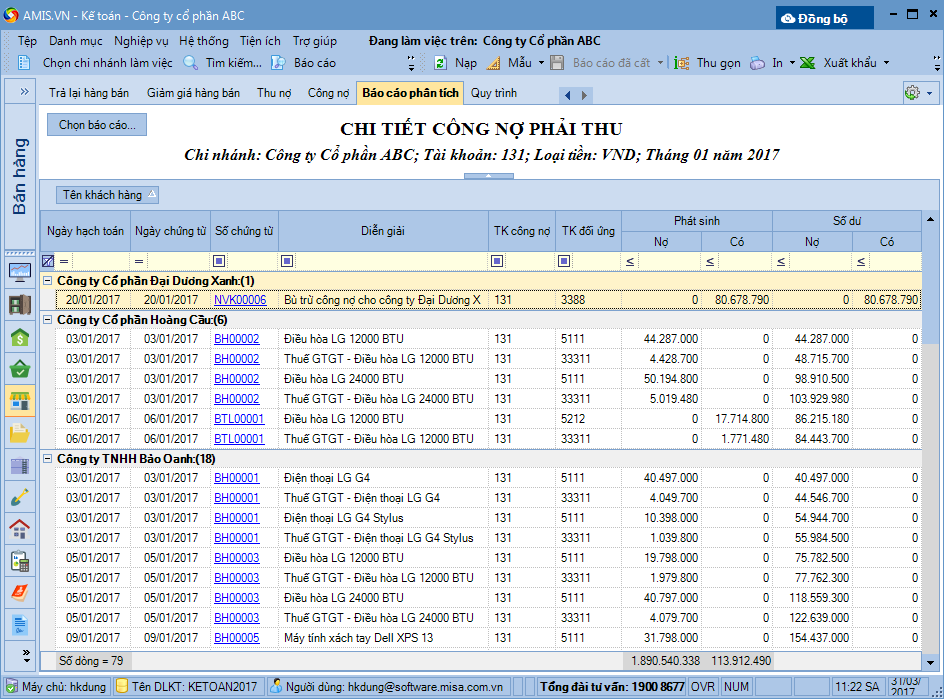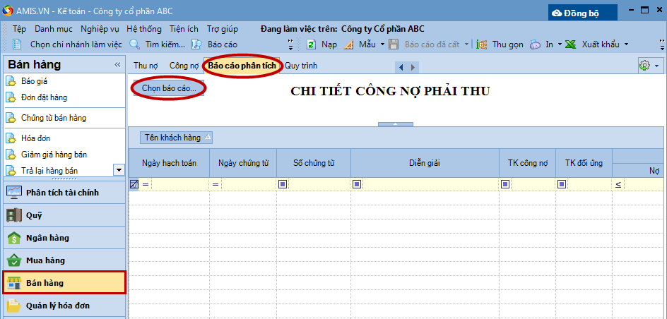 Phản ánh tình hình công nợ phải thu của một khách hàng theo từng tài khoản công nợ, chi tiết theo từng chứng từ phát sinh, nhân viên bán hàng, công trình, hợp đồng bán, đơn vị kinh doanh,...