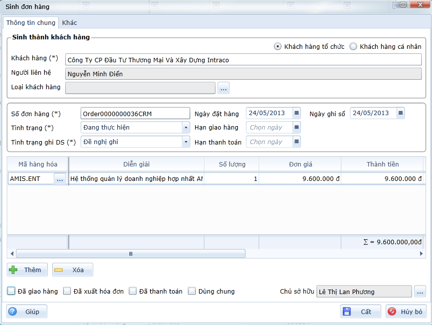 1. Trường hợp bản ghi được chọn là tiềm năng, chưa có trong phân hệ khách hàng thì khi thực hiện sinh đơn đặt hàng, phần mềm sẽ đồng thời sinh tiềm năng này thành khách hàng của doanh nghiệp. Kết quả của việc sinh đơn đặt hàng này sẽ gồm: