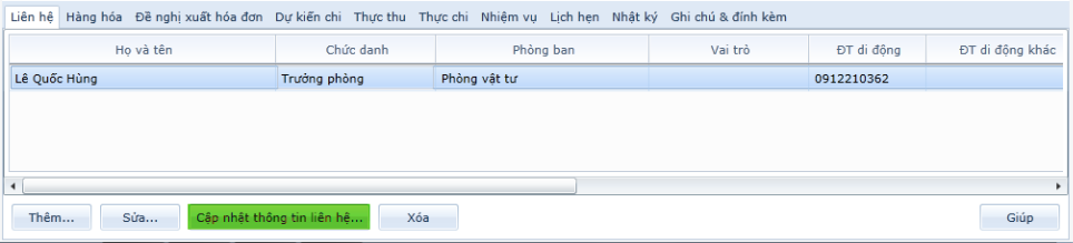 Liệt kê danh sách các liên hệ ứng với từng đơn đặt hàng để liên hệ trong quá trình thực hiện đơn đặt hàng, cho phép khai báo, cập nhật vai trò các liên hệ. Cách thao tác: I. Thêm liên hệ
