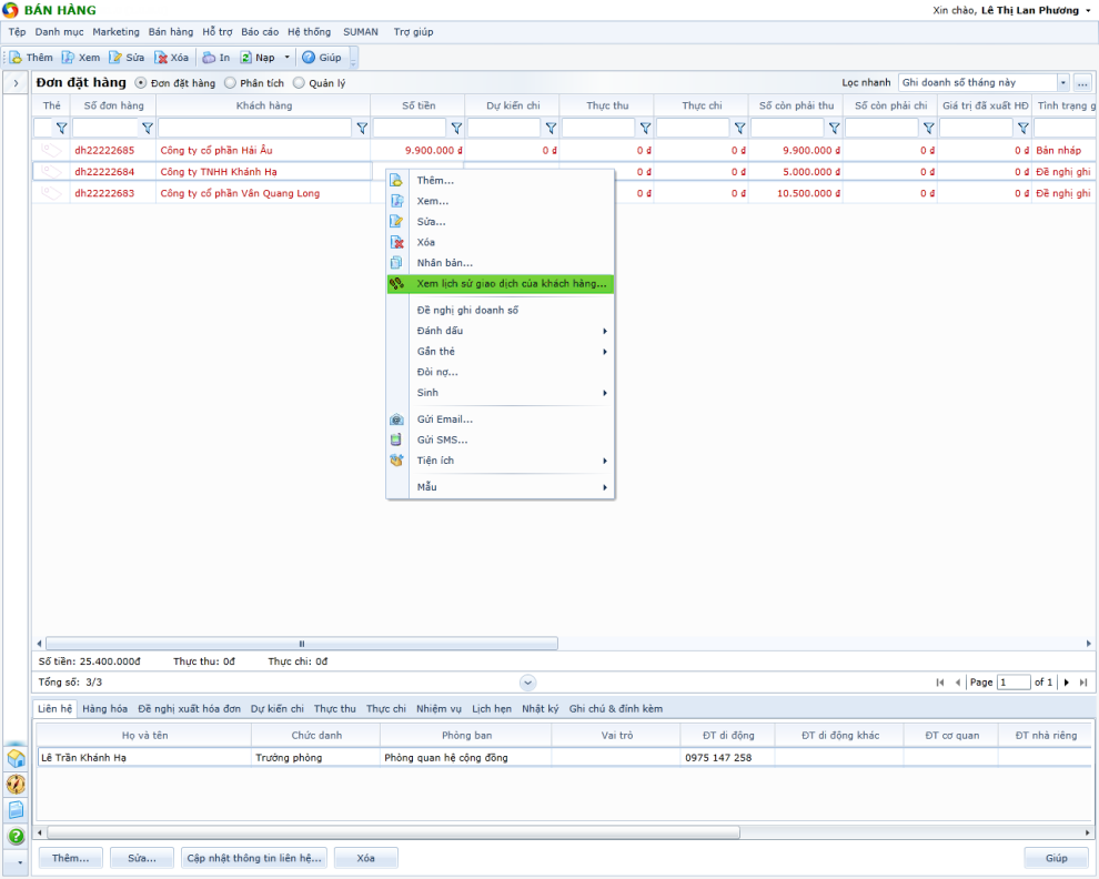 đây tại màn hình danh sách Đơn đặt hàng, nhấn chuột phải và chọn chức năng Xem lịch sử giao dịch của khách