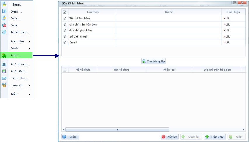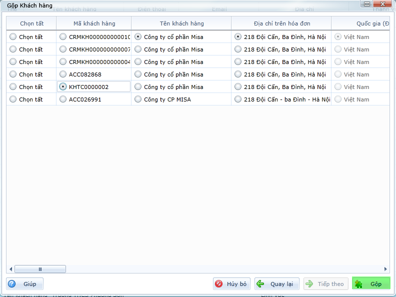 Tích chọn các khách hàng muốn gộp thông tin và nhấn Tiếp theo để thực hiện gộp các khách hàng