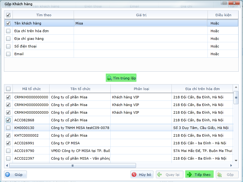 Nhấn Tìm trùng lặp để chương trình tự động tìm ra các khách hàng bị trùng lặp theo tiêu chí vừa nhập