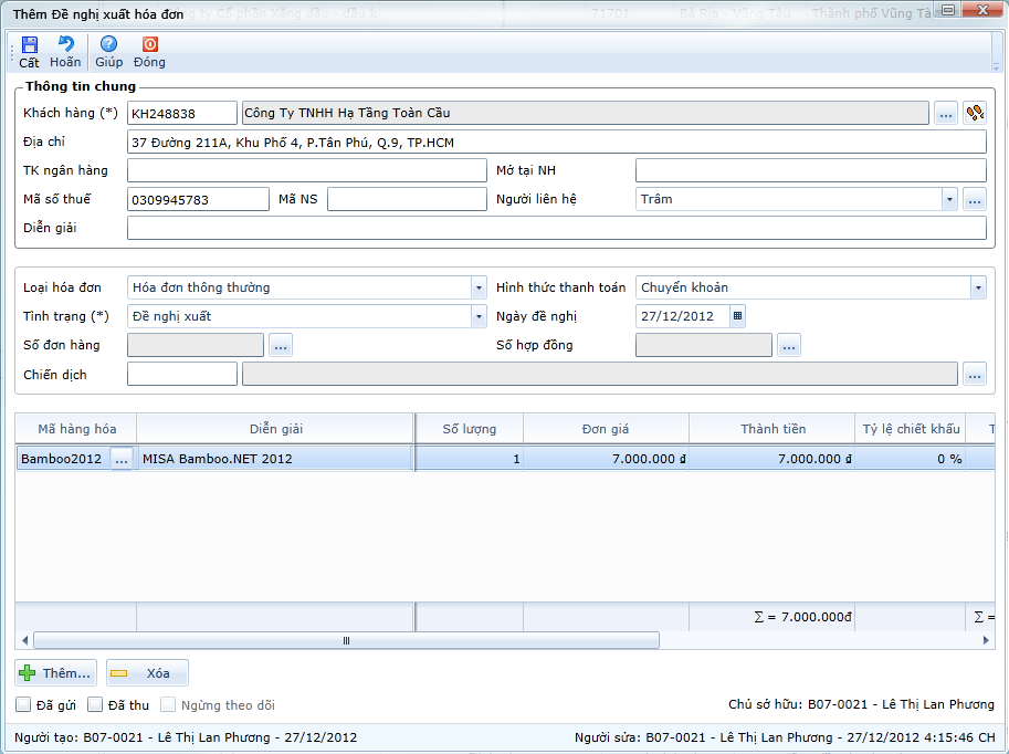 Tạo Đề nghị xuất hóa đơn và quản lý các Đề nghị xuất hóa đơn này của một khách hàng cụ thể.