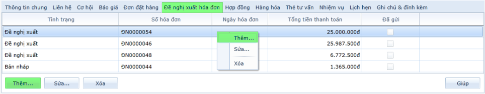 Nhấn Thêm trên màn hình danh sách tab Đề nghị xuất hóa đơn, hoặc nhấn chuột phải và chọn Thêm