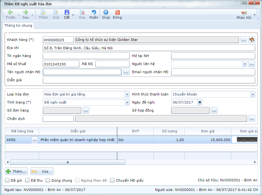 Cho phép khai báo và quản lý các Đề nghị xuất hóa đơn cho khách hàng đã gửi cho bộ phận kế toán. Tại đây, người sử dụng có thể thực hiện các chức năng: Thêm, Xem, Sửa đề nghị xuất hóa đơn Cách thao tác: