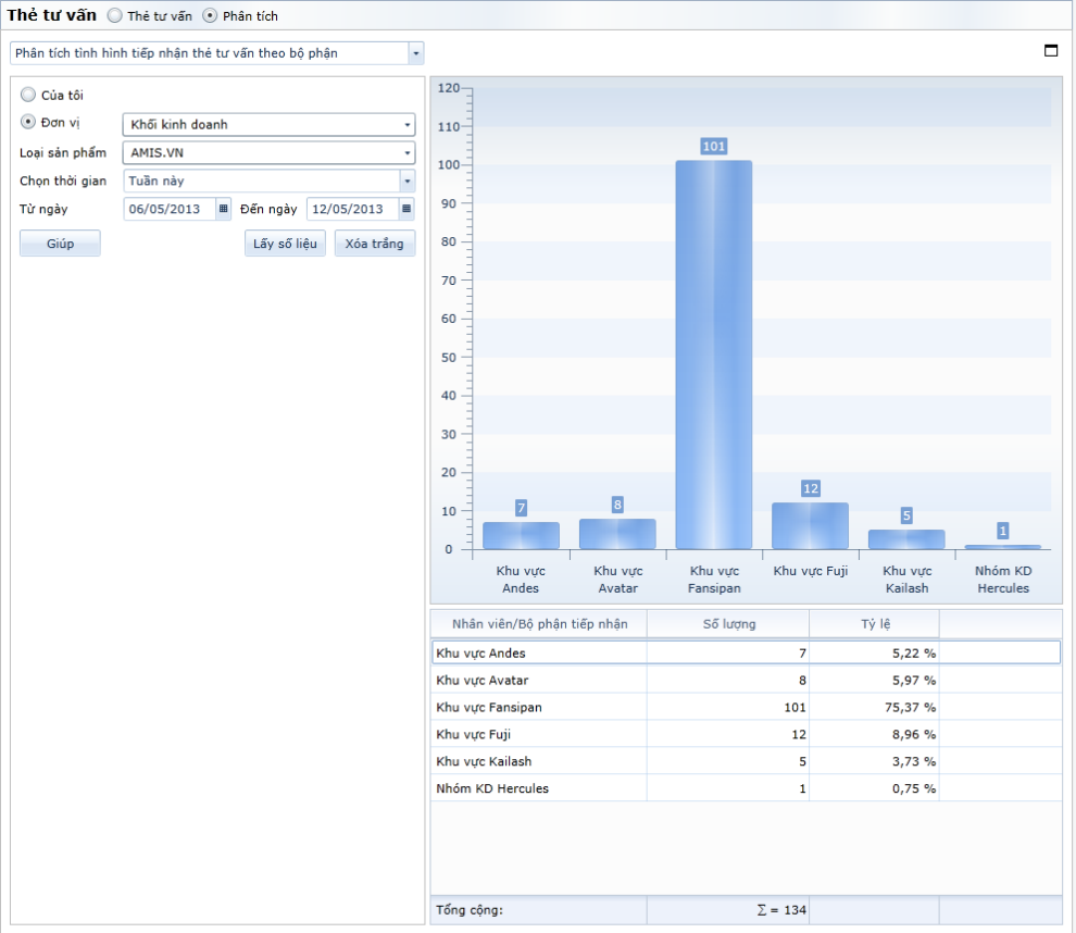 Home > Bán hàng > Hướng dẫn sử dụng các chức năng > Menu Nghiệp vụ > Hỗ trợ > Thẻ tư vấn > Phân tích thẻ tư vấn > Phân tích tình hình tiếp nhận thẻ tư vấn theo bộ phận