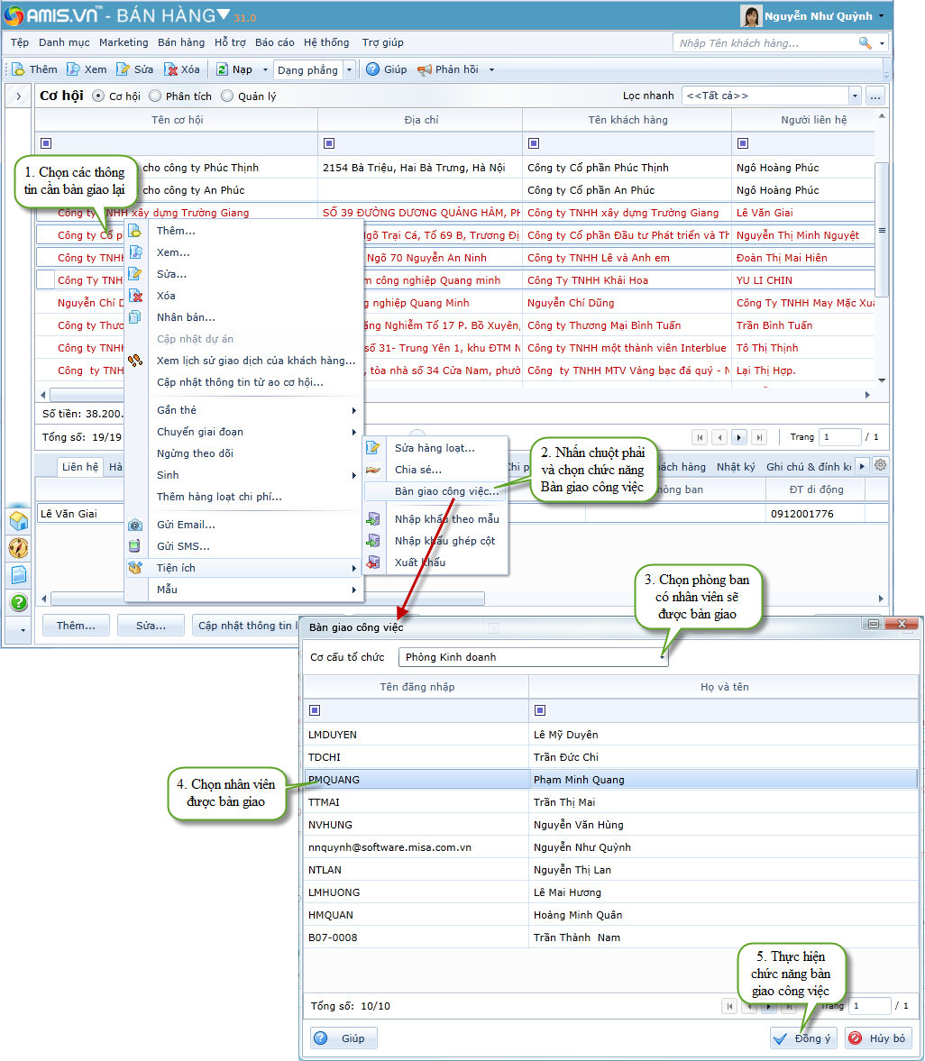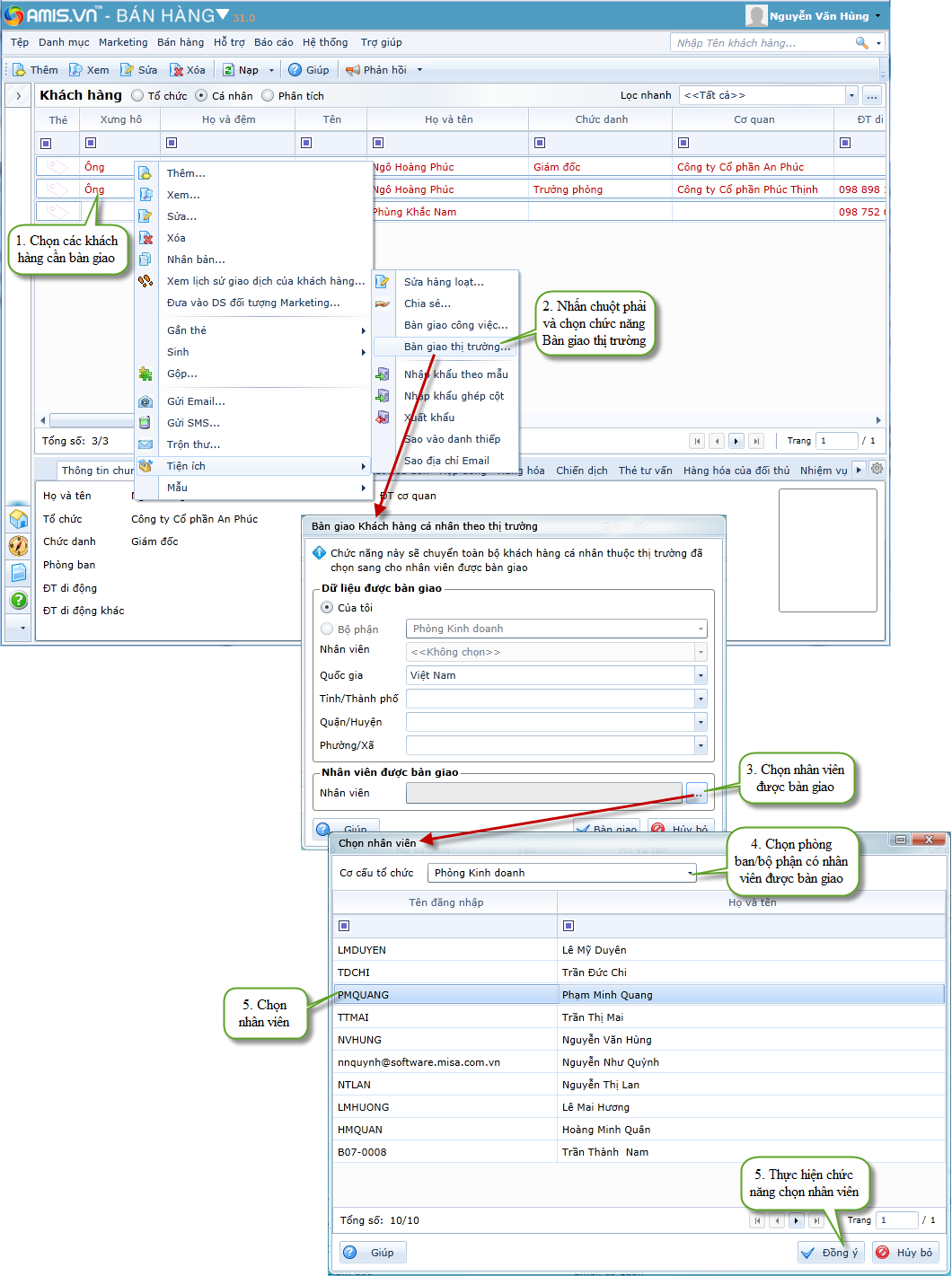 Việc bàn giao các công việc, các khách hàng đang được quản lý trên phần mềm AMIS.VN-Bán hàng sang cho nhân viên kinh doanh khác, được thực hiện trên phần mềm như sau: