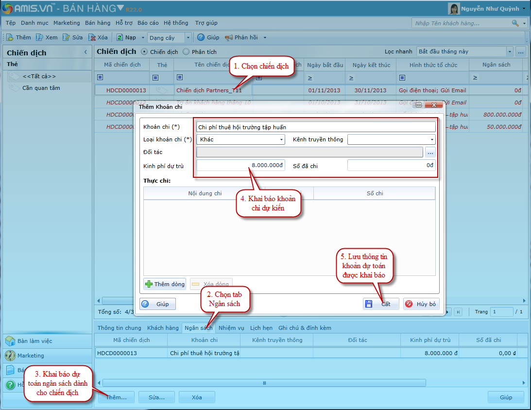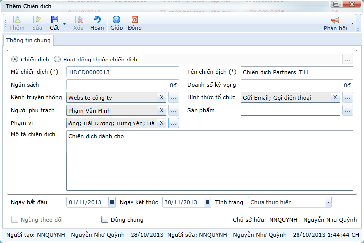dụng Bán hàng hỗ trợ công tác lập và tổ chức chiến dịch marketing nhằm vào đối tượng là các đối tác, đại lý, nhà phân phối thông qua các hoạt động sau: 1. Lập chiến dịch marketing dành cho các đại lý, nhà phân phối