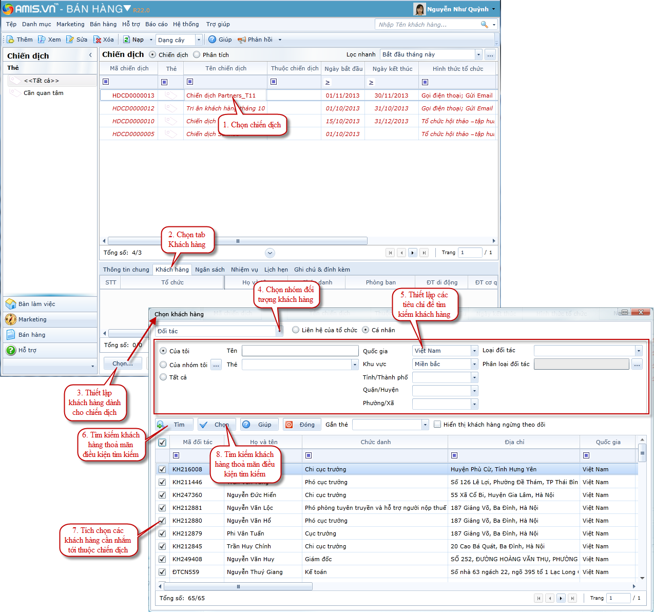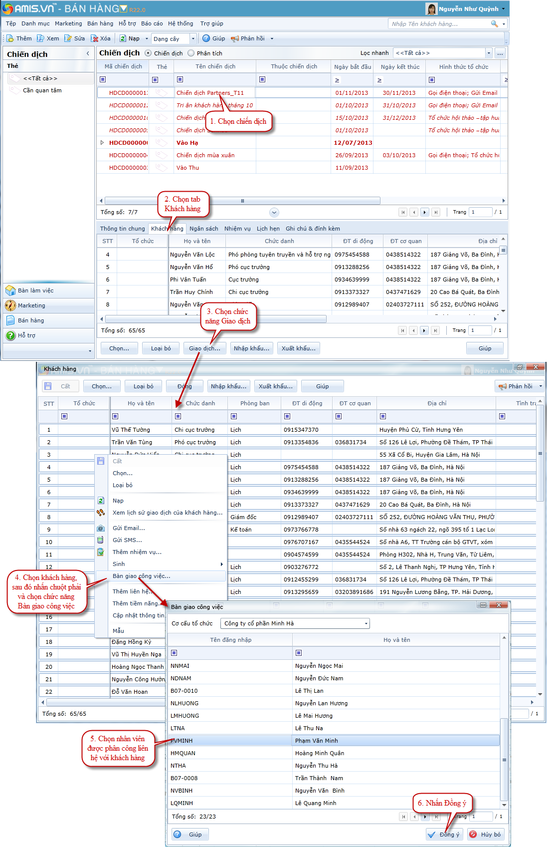 sách các đối tác mà mình cần liên hệ (chọn chức năng Giao dịch trên tab Khách hàng của chiến dịch được chọn):