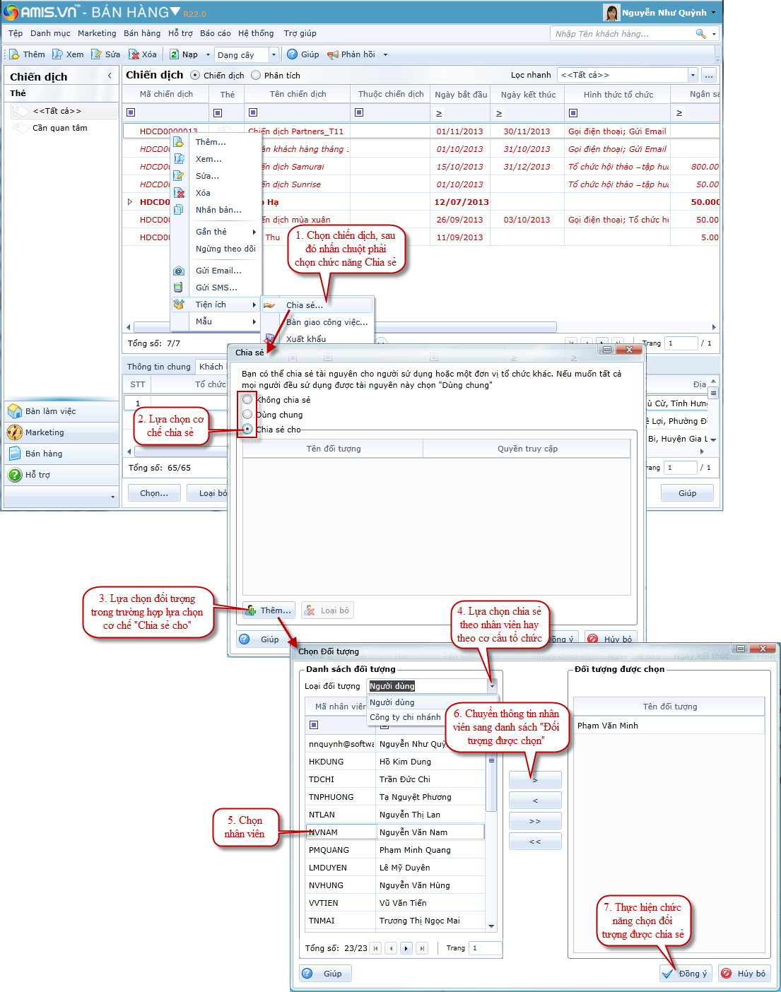 Để người được giao liên hệ có thể nhìn thấy thông tin về đối tác, sau khi chiến dịch được thiết lập cần phải chia sẻ thông