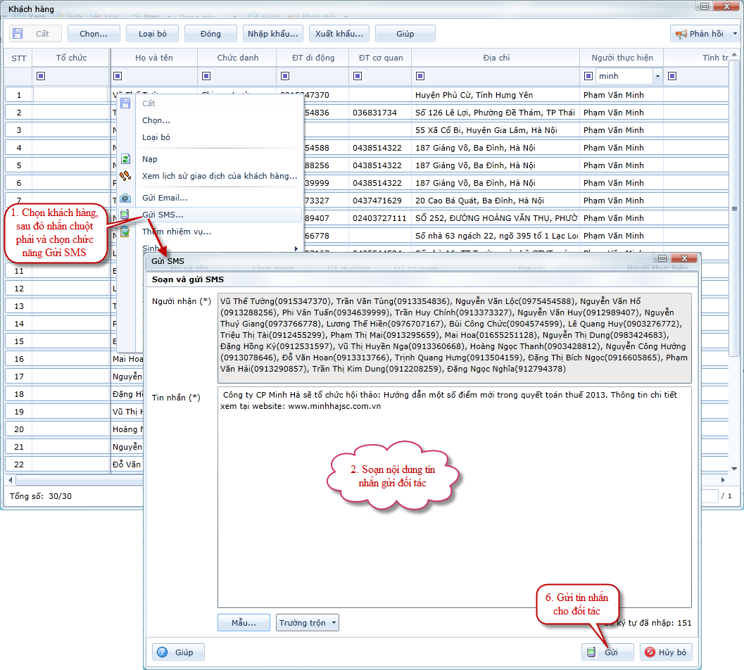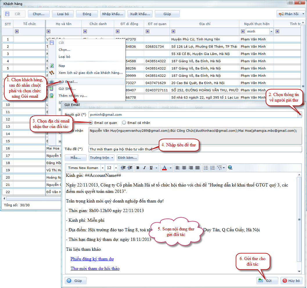 1. Để thực hiện được chức năng gửi email, mỗi nhân viên kinh doanh đều phải thực hiện trước chức năng Thiết lập tài khoản email trên menu Hệ thống. 2. Để chọn được nhiều đối tác trên danh sách, giữ phím Shift đồng thời sử dụng chuột để kích chọn.