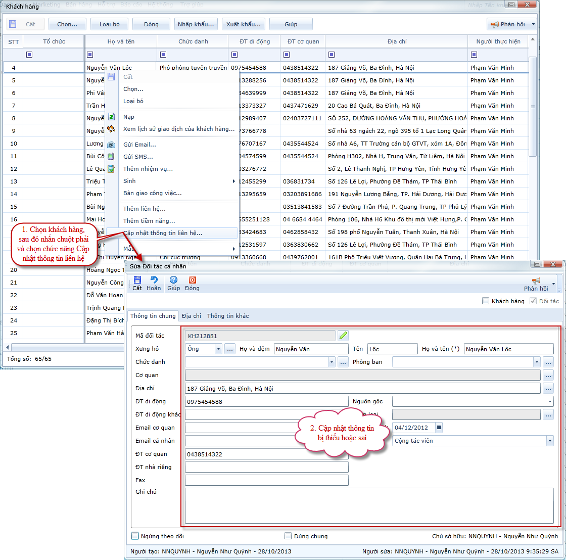 quá trình liên hệ nếu nhân viên kinh doanh phát hiện thông tin của đối tác đang lưu trên hệ thống bị thiếu hoặc sai một số thông tin nào đó