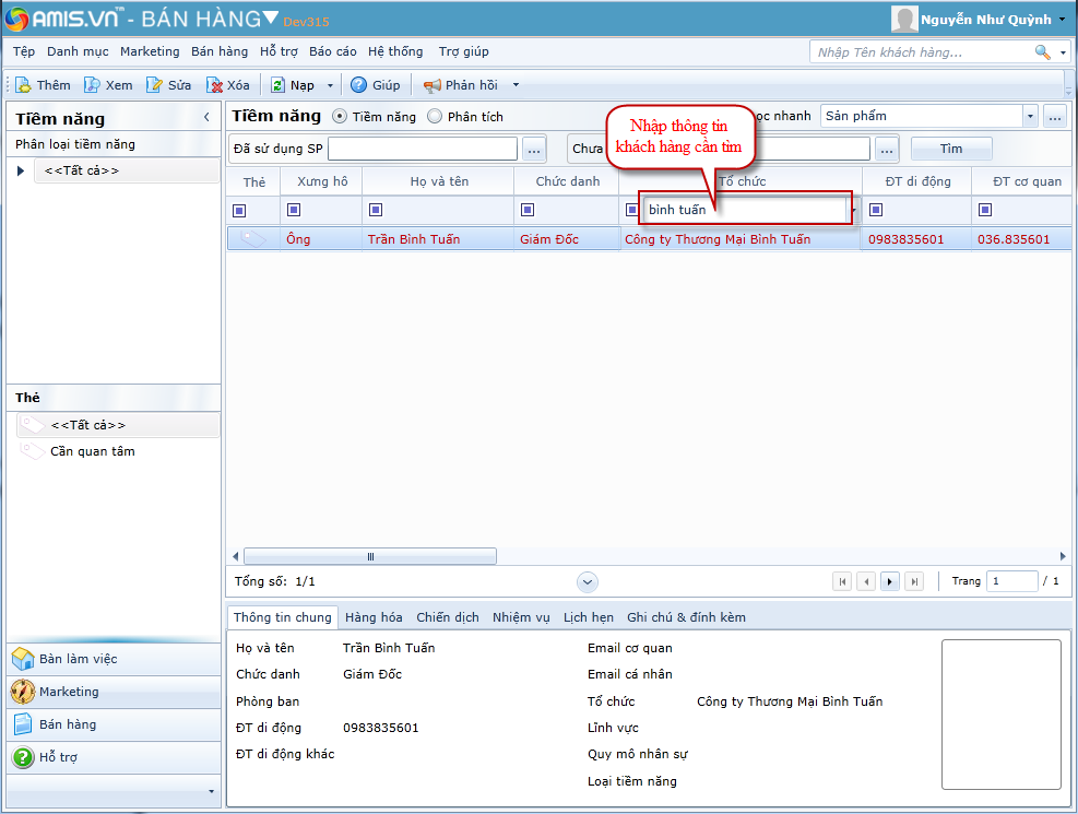 Nhân viên kinh doanh sẽ lọc ra thông tin khách hàng tiềm năng cần liên hệ trên phân hệ Tiềm năng:
