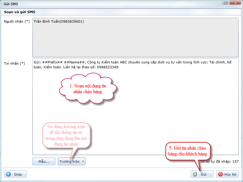 Gửi tin nhắn chào hàng: chọn khách hàng sau đó nhấn chuột phải và chọn chức năng Gửi SMS: