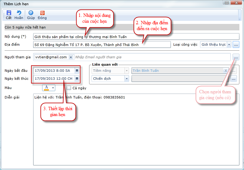 Khai báo thông tin về cuộc hẹn, sau đó chọn chức năng Cất trên thanh công cụ.