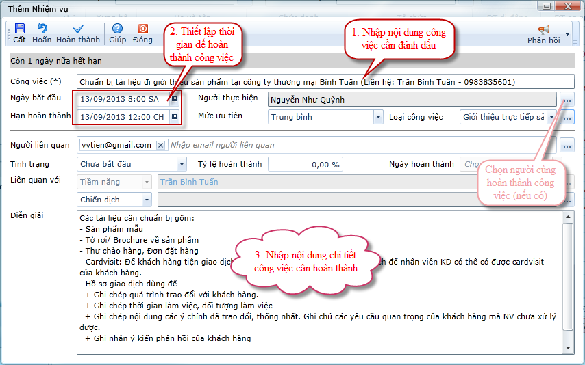 Khi đó thông tin công việc sẽ tự động chuyển ra ngoài màn hình Bàn làm việc (phần Nhiệm vụ)để nhân viên kinh doanh tiện theo dõi và hoàn thành đúng hạn.