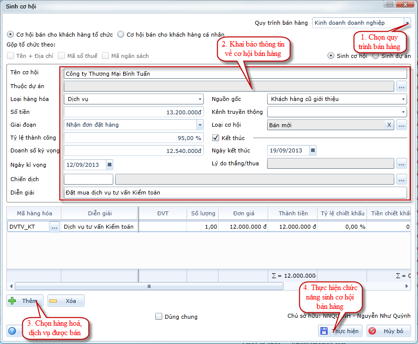 Chọn thông tin khách hàng trên phân hệ Tiềm năng, sau đó nhấn chuột phải và chọn chức năng Sinh\Cơ hội:
