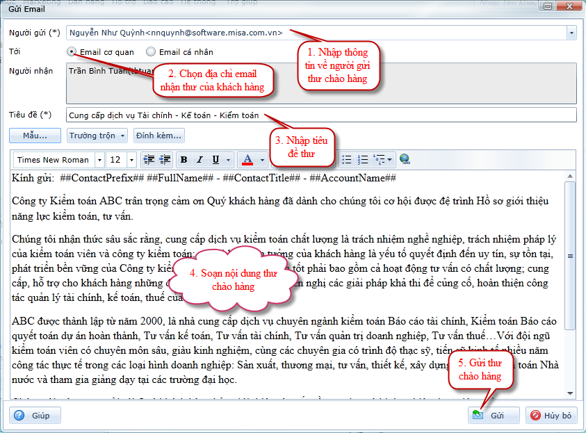 1. Để thực hiện được chức năng gửi email, mỗi nhân viên kinh doanh đều phải thực hiện trước chức năng Thiết lập tài khoản email trên menu Hệ thống. 2. Nhân viên kinh doanh có thể lấy nhanh thông tin địa chỉ email người liên hệ của khách hàng hàng để phục vụ cho việc gửi thư trên các công cụ gửi thư khác như: Yahoo, Gmail, Thunderbird... => chọn khách hàng tiềm năng tại màn hình danh sách sau đó nhấn chuột phải và chọn chức năng Tiện ích\Sao địa chỉ Email.