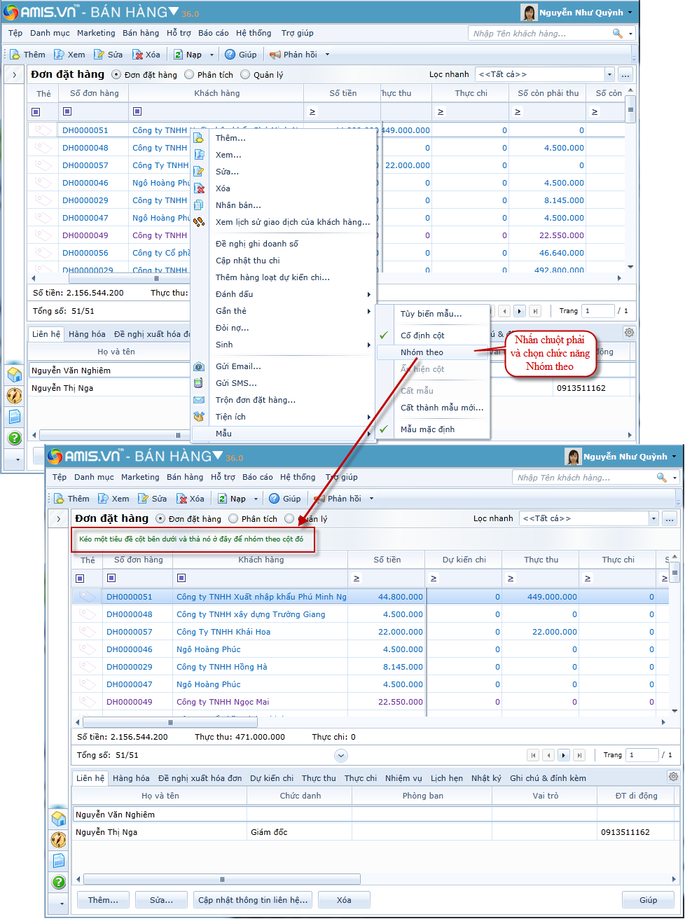 Nhóm theo: Cho phép nhóm các cột trên màn hình dach sách theo các tiêu chí bất kỳ: