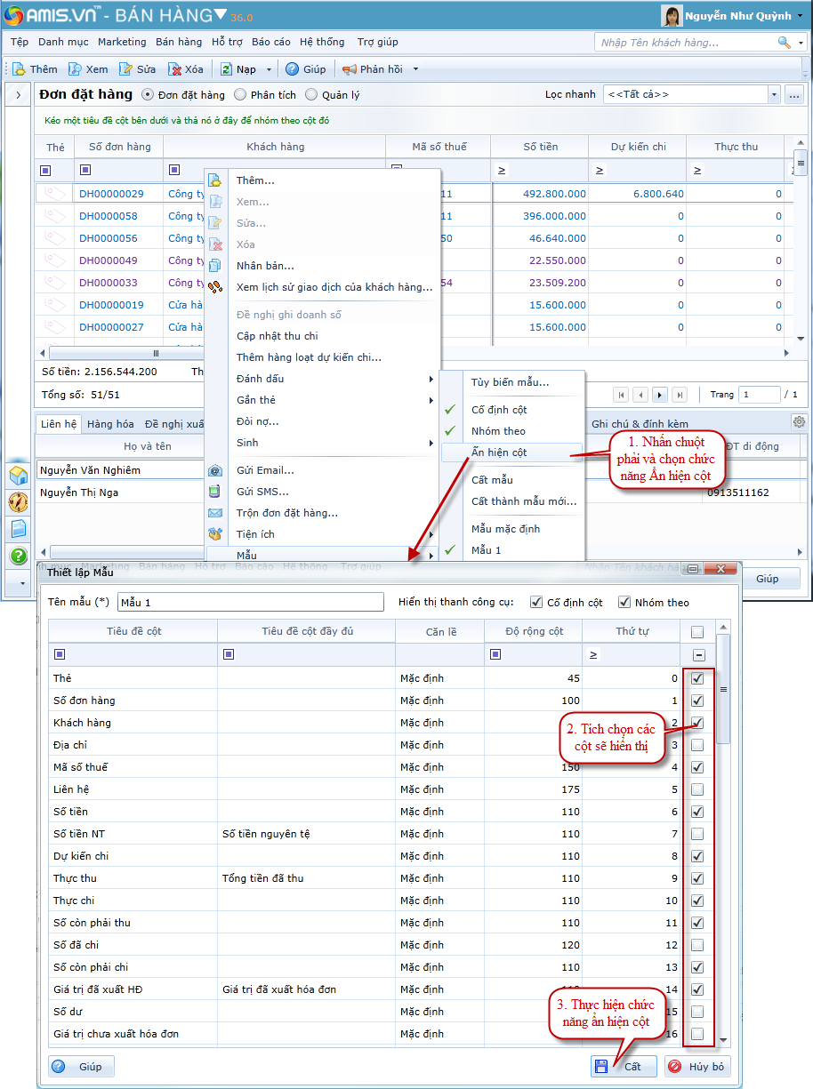 Ẩn hiện cột: cho phép thiết lập nhanh các cột ẩn/hiện trên màn hình danh sách => không áp dụng với Mẫu mặc định: