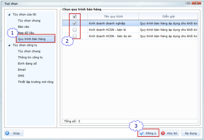 Tích chọn các quy trình bán hàng mà mình áp dụng, sau đó nhấnĐồng ý.