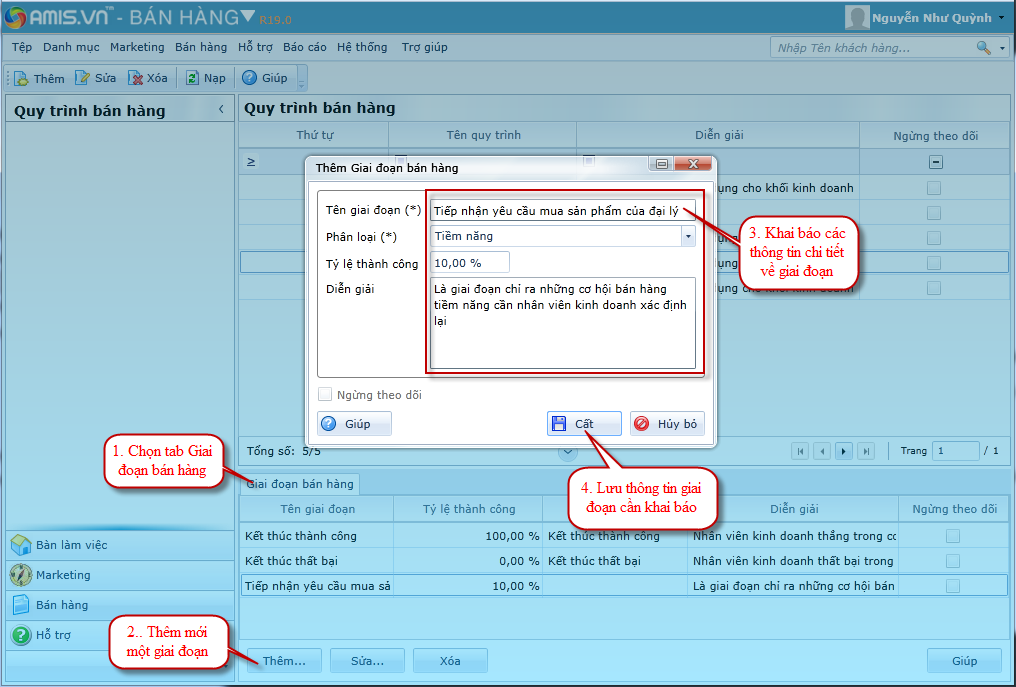 Với mỗi quy trình bán hàng sau khi được thiết lập trên ứng dụng, hệ thống đều tự động sinh ra hai giai đoạn không cho phép người dùng sửa, xoá là Kết thúc thành công và Kết thúc thất bại. Với các giai đoạn khác của quy trình, người dùng thực hiện khai báo như sau: