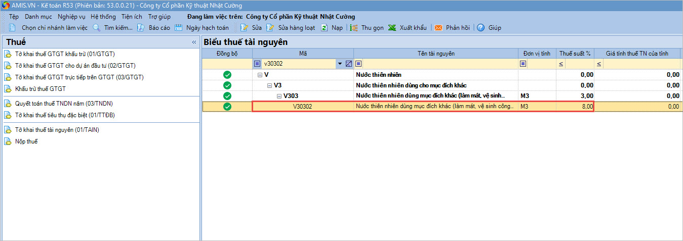 Cập nhật phần mềm đáp ứng thay đổi của HTKK 4.4.2: Cập nhật lại thuế suất Thuế tài nguyên của mã V30302 từ 3% lên 8% trên danh mục Biểu thuế tài nguyên và khi lập tờ khai thuế tài nguyên.