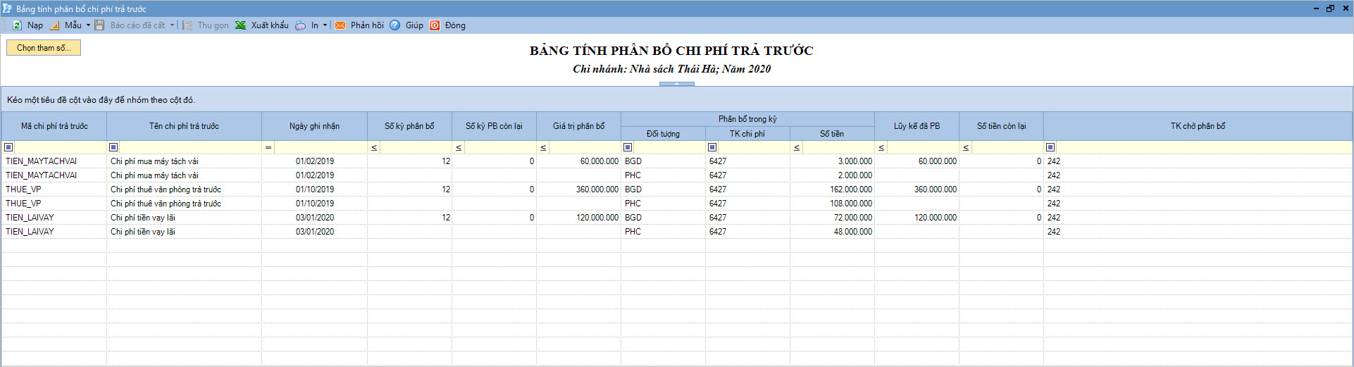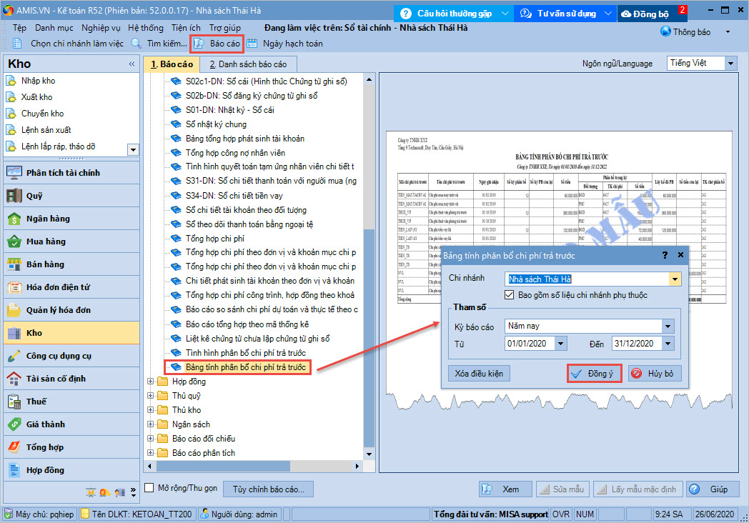 Chọn báo cáo Bảng tính phân bổ chi phí trả trước.
