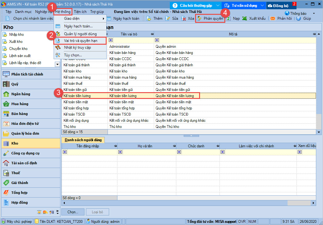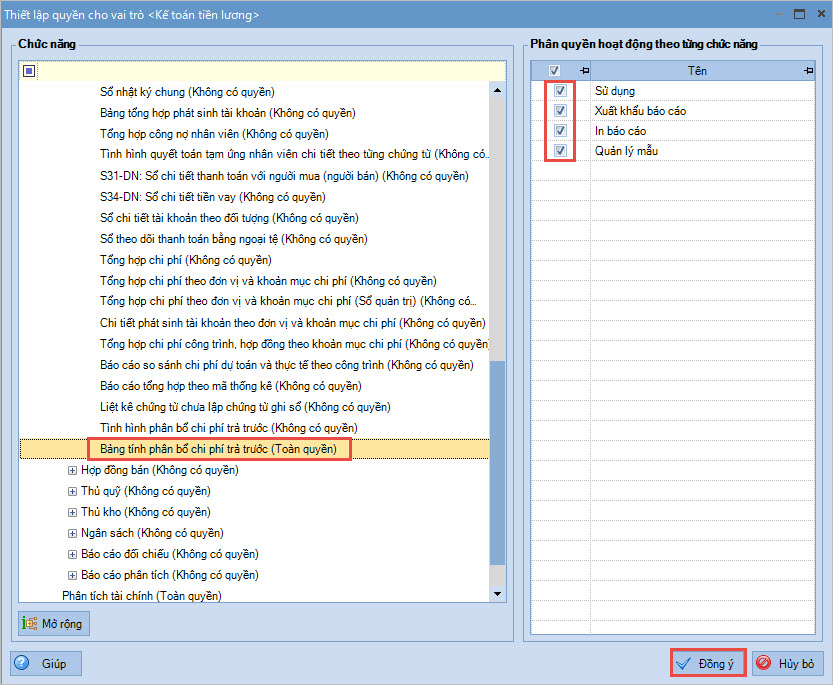 Trước hết Kế toán trưởng (admin) cần thực hiện phân quyền cho kế toán viên được phép sử dụng báo cáo này: