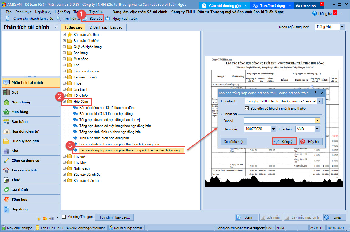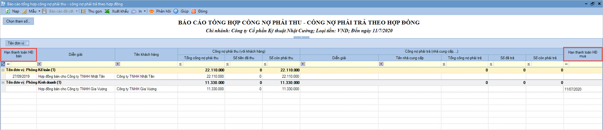 Chương trình đã đáp ứng được báo cáo Tổng hợp công nợ phải thu - công nợ phải trả theo hợp đồng. Tuy nhiên trên báo cáo chưa thể hiện được trường thông tin hạn thanh toán của Hợp đồng mua/Hợp đồng bán.