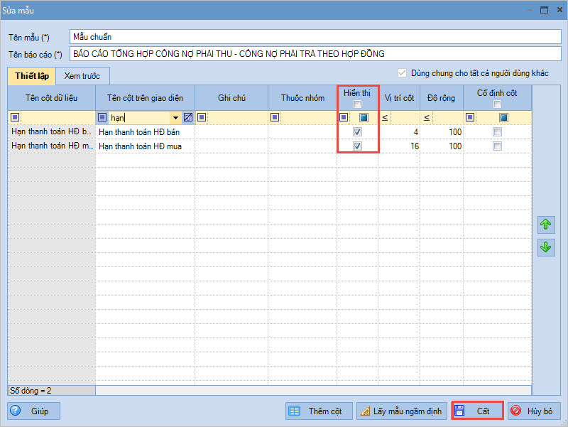 Trên giao diện Sửa mẫu, tích chọn hiển thị cho các cột Hạn thanh toán hợp đồng mua và Hạn thanh toán hợp đồng bán.