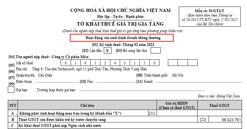 Cập nhập danh mục ngành nghề của tờ khai thuế GTGT (01/GTGT) đối với các tờ khai từ tháng 1/2021 hoặc quý I/2021