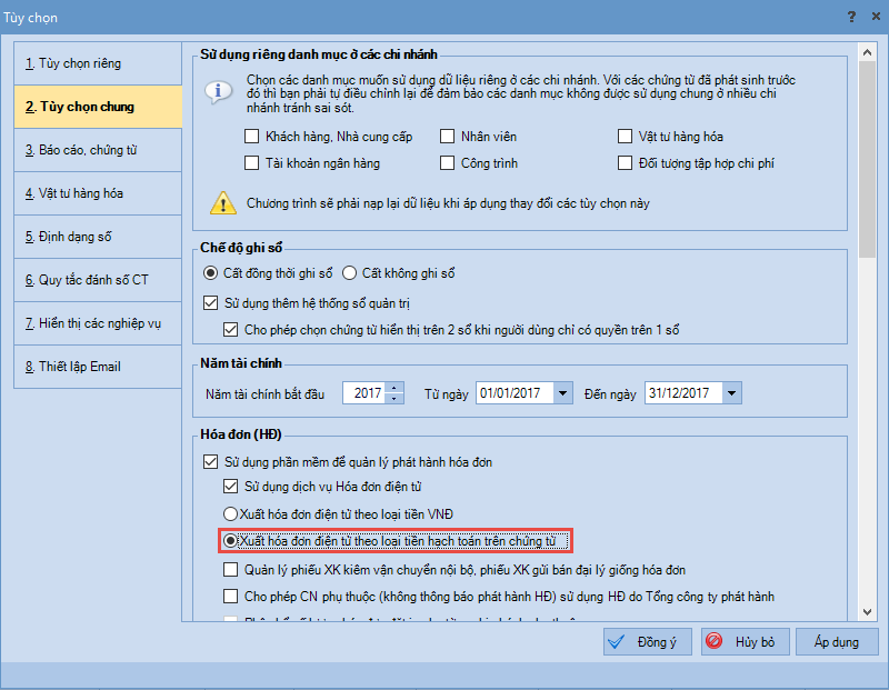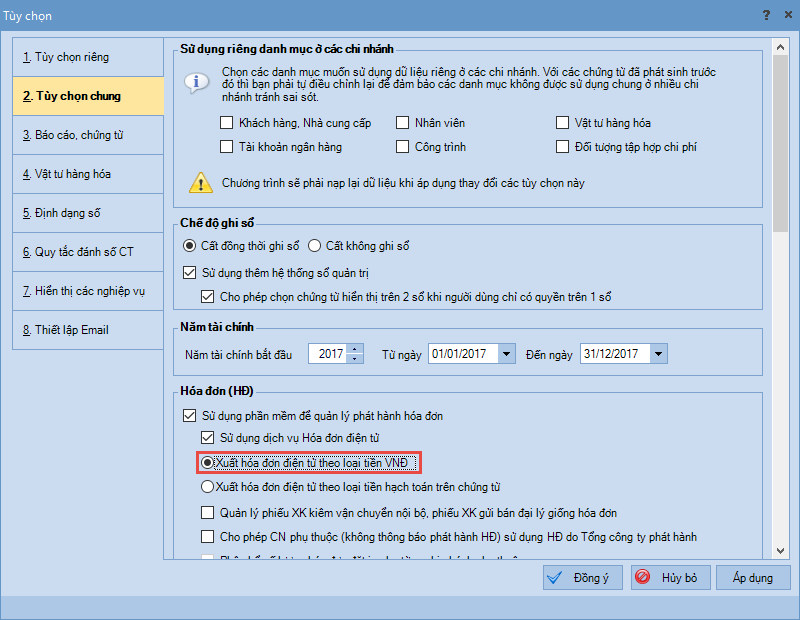 Trên menu Hệ thống\Tùy chọn\Tùy chọn chung. Tại mục Hóa đơn, chọn Xuất hóa đơn điện tử theo loại tiền VNĐ