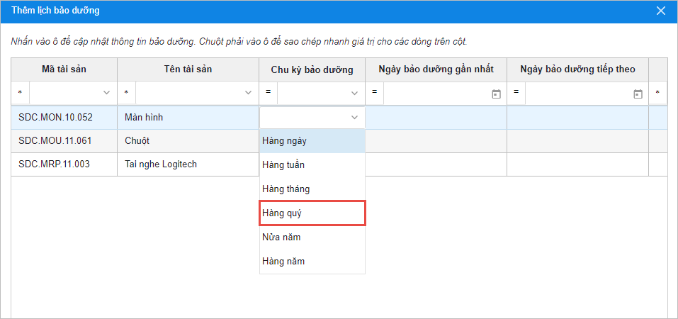 Tại phân hệ Lịch bảo dưỡng, khi Thêm mới Lịch bản dưỡng, chương trình cho phép lựa chọn chu kỳ Hàng quý (6 tháng).