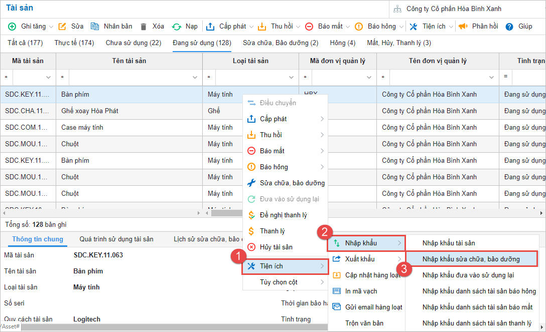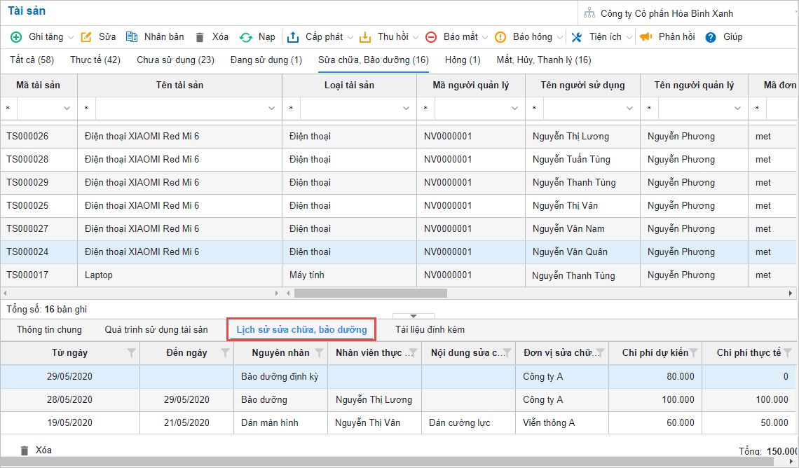 Trên "Danh sách tài sản", bổ sung thêm mục Lịch sử sửa chữa, bảo dưỡng.