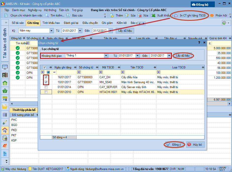 Hỗ trợ in hàng loạt chứng từ ghi tăng tài sản cố định, phục vụ cho công tác lưu chứng từ