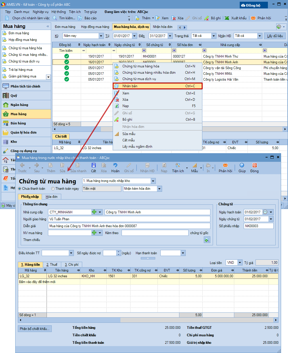 1. Mở chứng từ mua hàng có nội dung tương tự với chứng từ mua hàng cần lập.