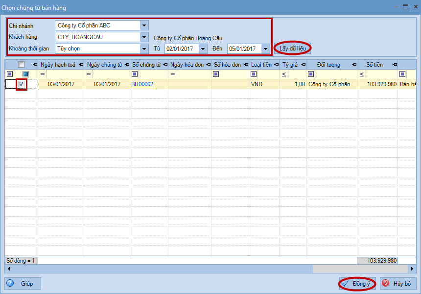 3. Thiết lập điều kiện tìm kiếm chứng từ bán hàng, nhấn Lấy dữ liệu.