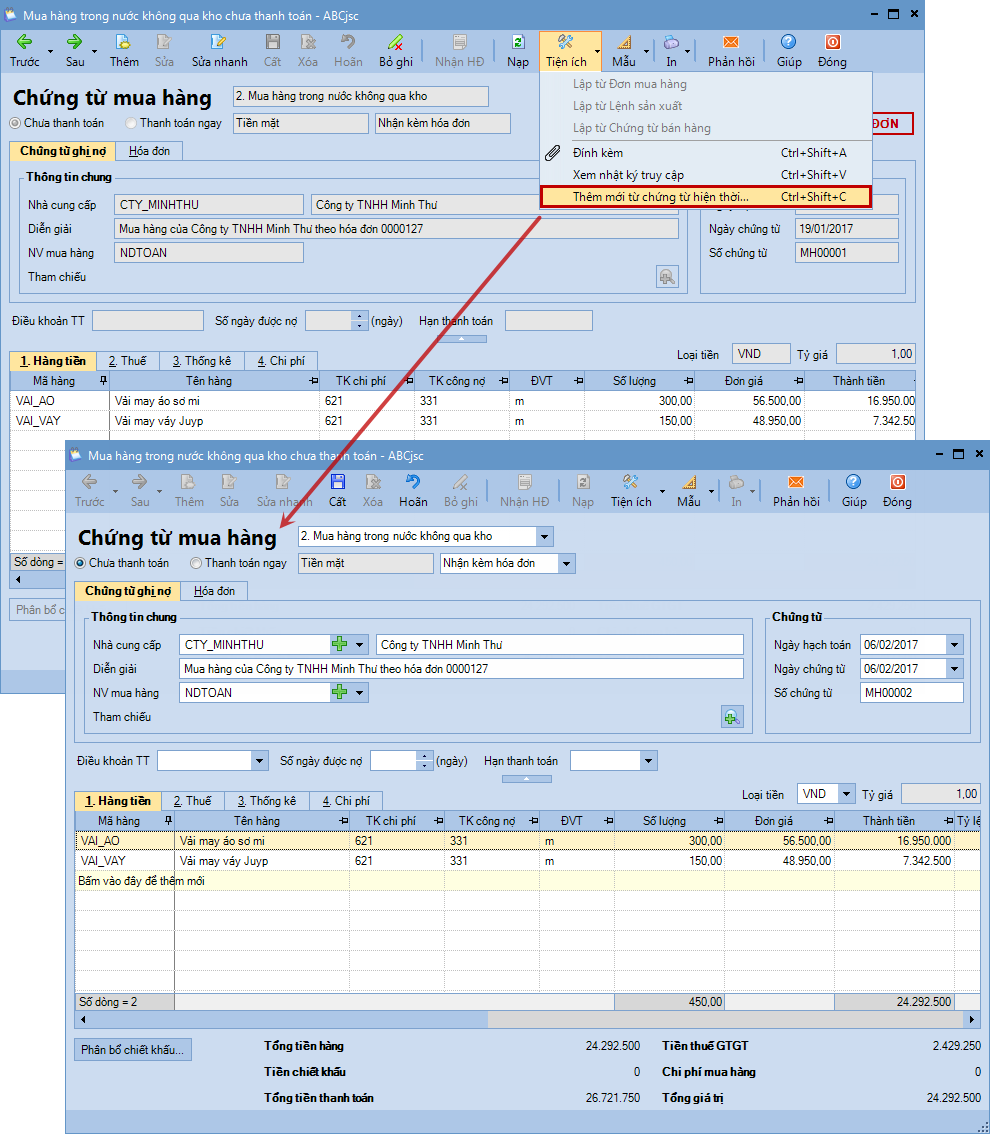 Cách 2: Lập nhanh từ chứng từ mua hàng