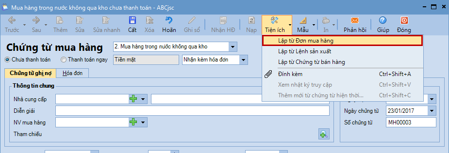 2. Vào Tiện ích\Lập từ Đơn mua hàng.