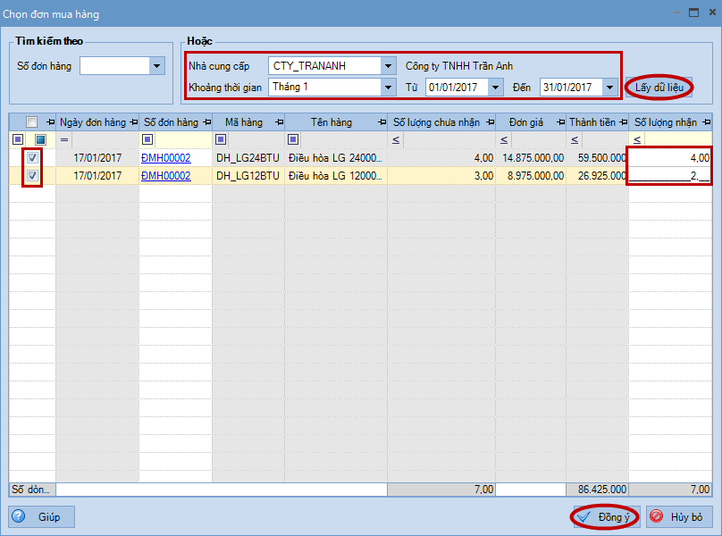 3. Thiết lập điều kiện tìm kiếm đơn mua hàng, nhấn Lấy dữ liệu.