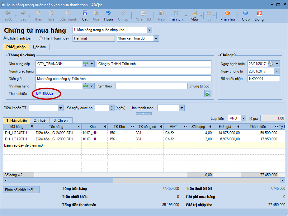 2.2. Lập chứng từ mua hàng từ đơn mua hàng