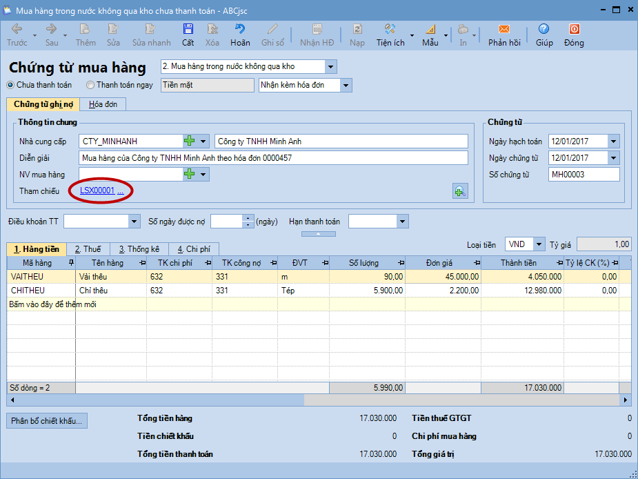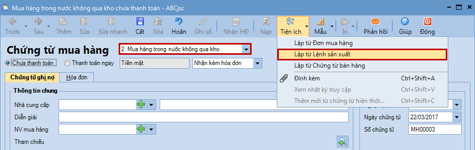 2.3. Lập chứng từ mua hàng từ lệnh sản xuất