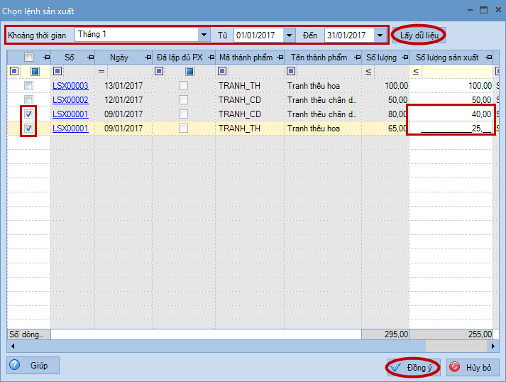 3. Thiết lập điều kiện tìm kiếm lệnh sản xuất, nhấn Lấy dữ liệu.
