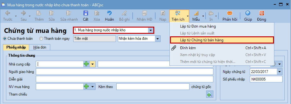 2. Vào Tiện ích\Thêm mới từ chứng từ hiện thời.