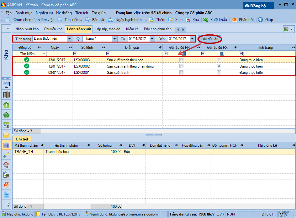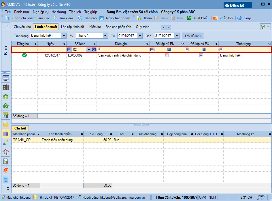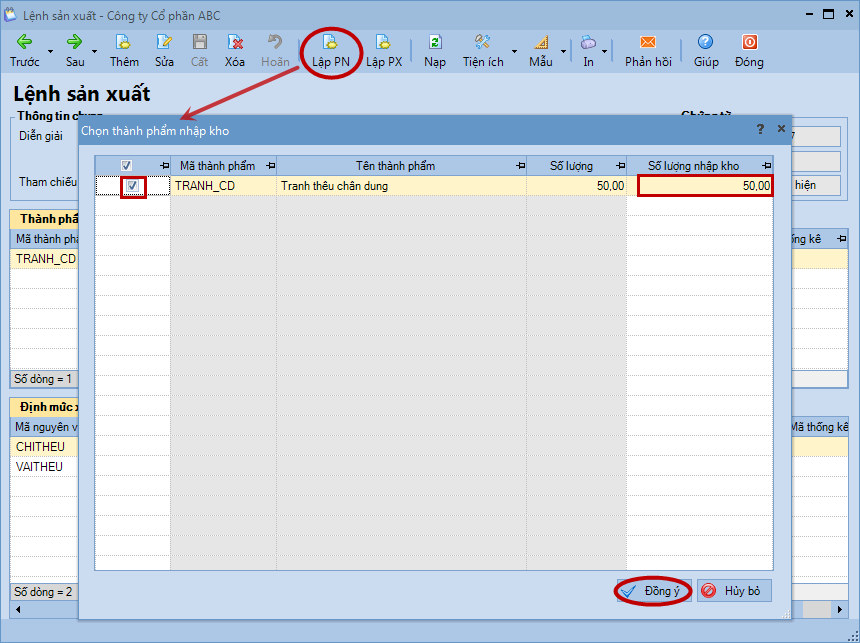 1. Chọn lệnh sản xuất trên trên danh sách lệnh sản xuất.