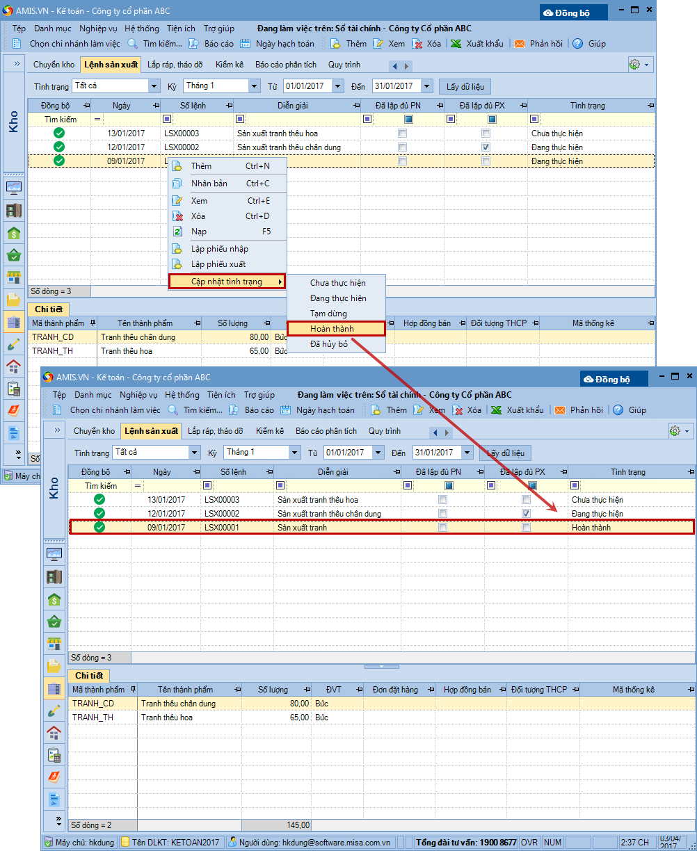 2.3. Cập nhật trình trạng lệnh sản xuất