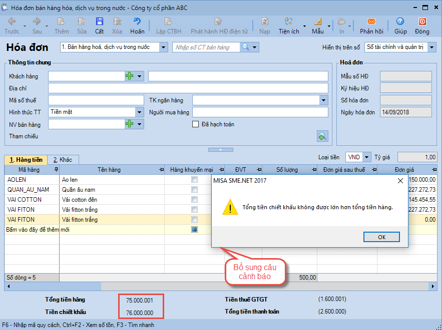 Giả sử, kế toán lập hóa đơn bán hàng có tổng tiền chiết khấu lớn hơn tổng tiền hàng, khi cất sẽ hiển thị cảnh báo