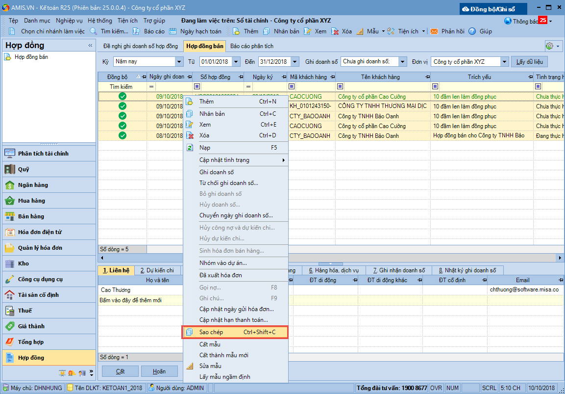 2. Nhấn chuột phải và chọn Sao chép, chương trình sẽ sao chép toàn bộ danh sách hợp đồng.